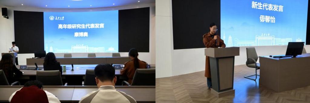 2024级研究生康博奥作为高年级学生代表发言,他鼓励新生要“学思并进,知行合一”,筑牢知识根基,勇于探索创新;同时要“修身立德,磨炼品质”,做积极阳光、德才兼备的追梦人。2025级新生代表毋馨怡则以校训“弘毅明德,笃学创新”为引,号召同学们克险阻、铸品格、筑根基、拓新路,在数智院这片智慧与梦想交织的沃土上,奔赴追寻真理的浩瀚征程。