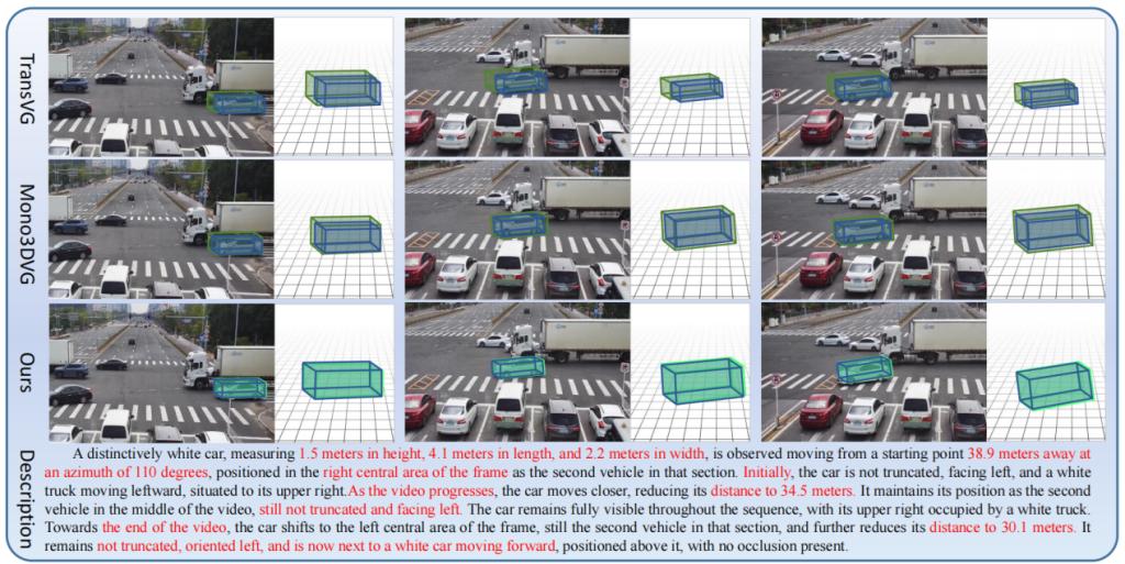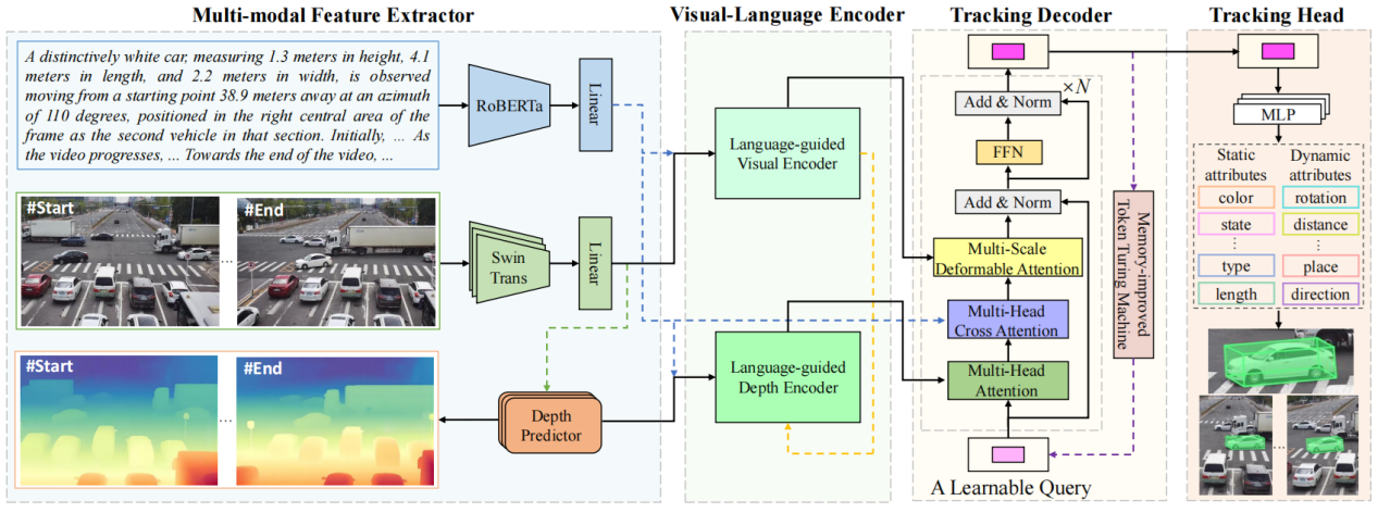 该研究首次聚焦并深入研究了单目视频下的三维视觉语言跟踪难题。视觉语言跟踪(VLT)作为连接人机性能差距的新兴范式,虽在二维空间扩展了文本驱动视频理解的边界,却始终受限于三维跟踪能力的发展瓶颈。现有三维跟踪技术高度依赖点云、深度测量、雷达等昂贵传感器,且缺乏与语言描述的深度融合,严重制约了该技术在现实场景中的普及应用。针对这一挑战,研究团队开创性地提出基于单目视频的三维视觉语言跟踪框架,取得三项突破性进展:首次定义单目视频三维视觉语言跟踪(Mono3DVLT)任务范式;构建首个大规模数据集Mono3DVLT-V2X,通过大语言模型生成与人工验证相结合,为79,158段视频序列提供包含2D/3D边界框标注的自然语言描述;研发专用神经网络模型Mono3DVLT-MT,其多模态特征提取器、视觉语言编码器、跟踪解码器和跟踪头组成的创新架构,在Mono3DVLT-V2X数据集上建立性能基准。实验表明,该模型显著优于现有技术方案,为三维视觉语言跟踪领域的发展奠定重要基础。